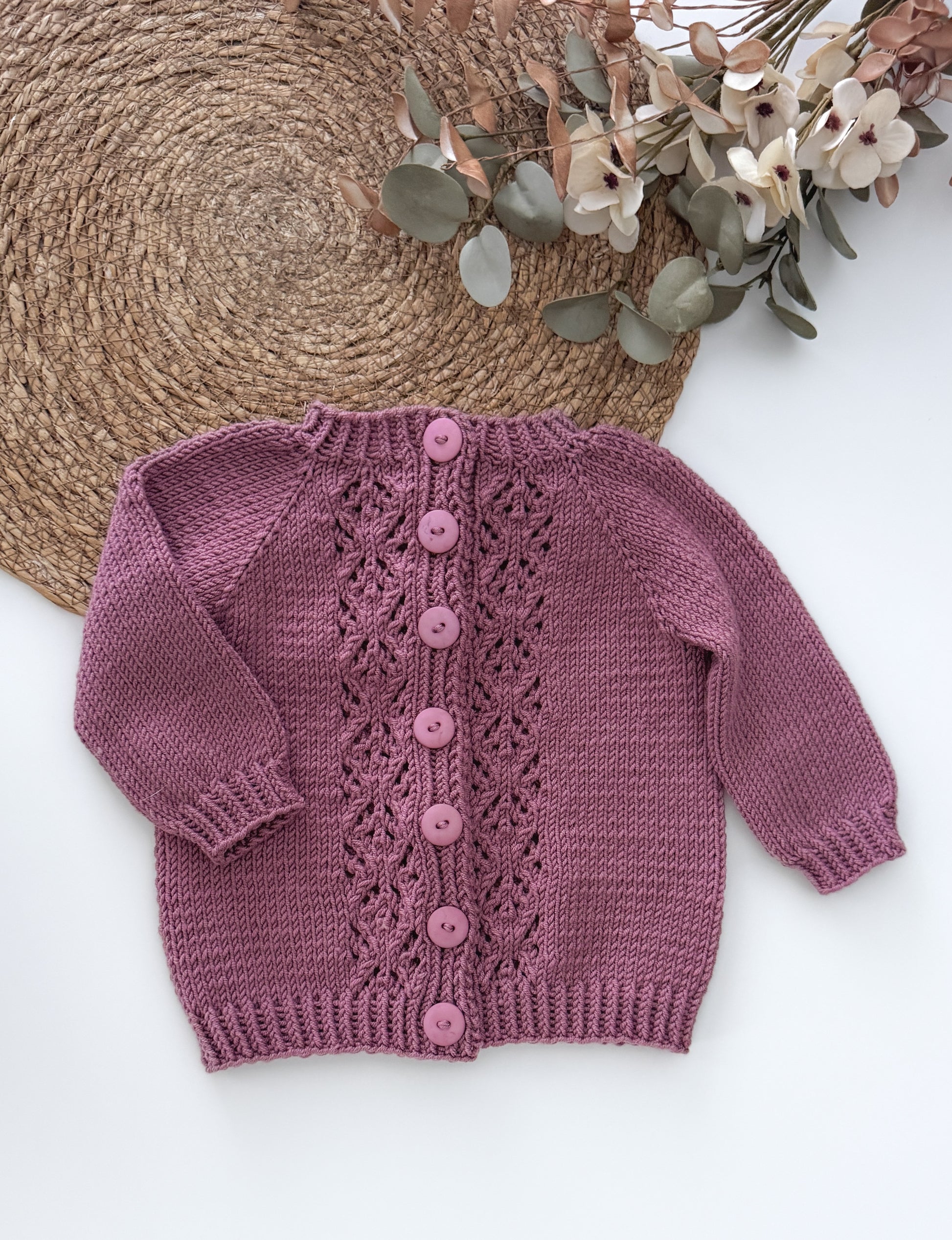 Anelle tykkjakke strikkes ovenfra og ned i glattstrikk med mønster ved knappestolpene. Knappestolpene strikkes i vrangbord og samtidig som resten av jakken slik at du slipper å ta opp masker til slutt.