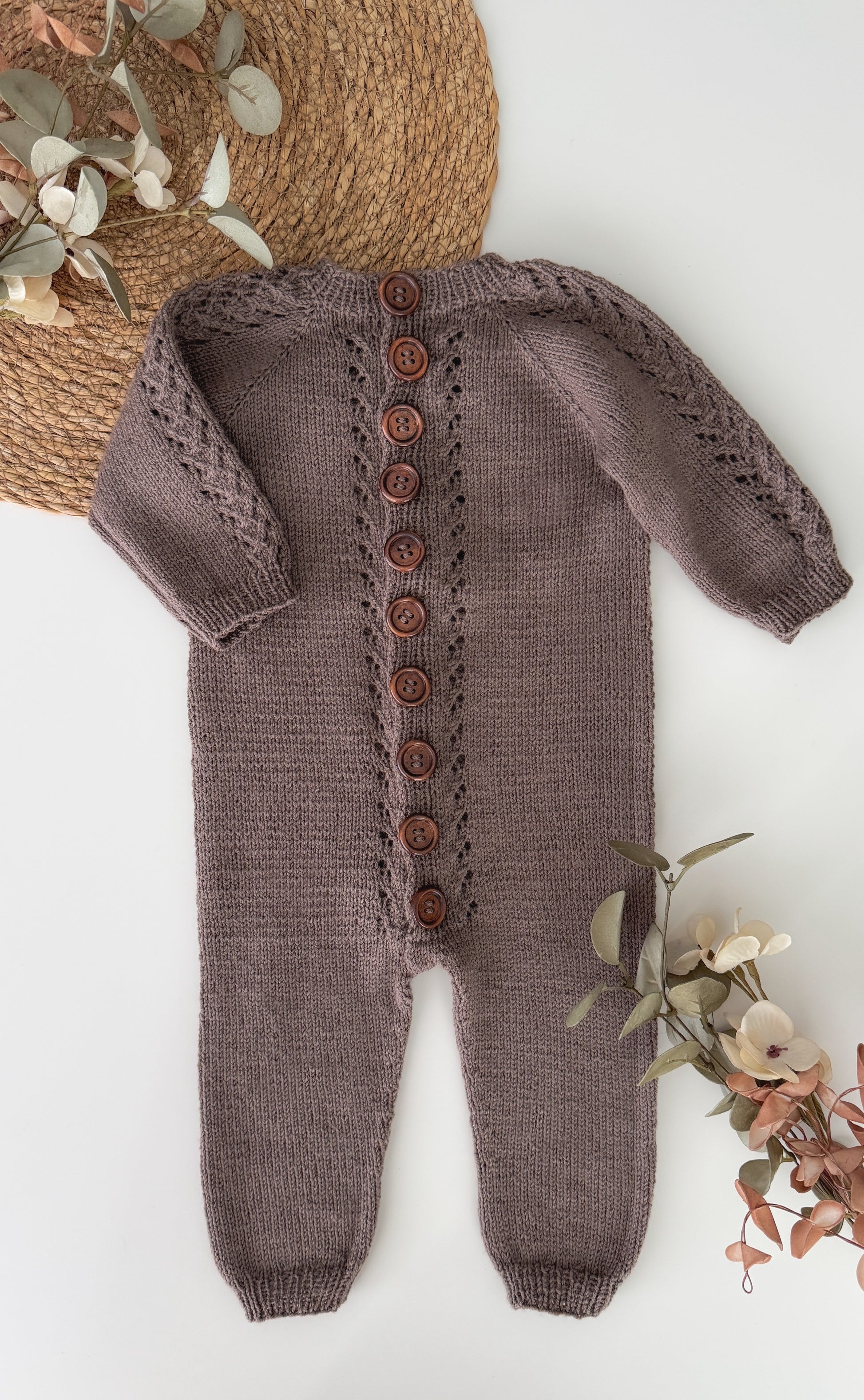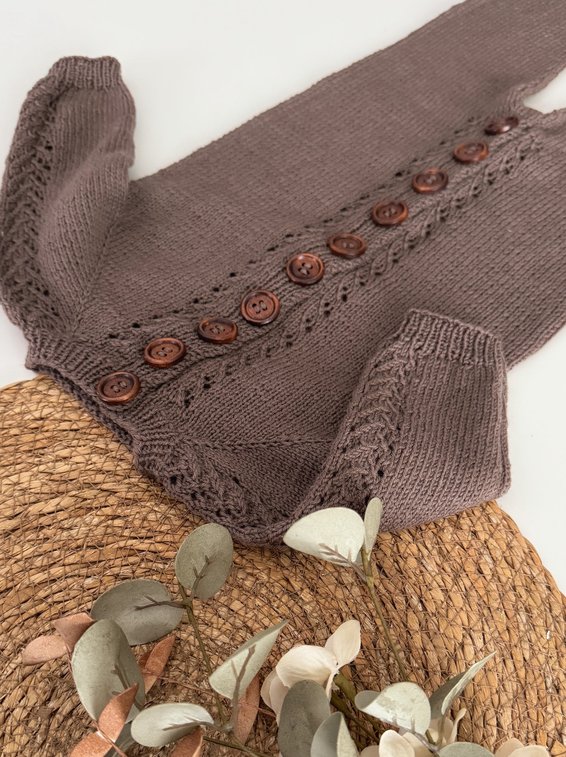 Bittelitendress strikkes ovenfra og ned, frem og tilbake i glattstrikk med raglanøkninger, mønster over ermemaskene og ved knappestolpene. Det strikkes vendestrikk i nakken for bedre passform. Knappestolpene strikkes samtidig slik at du slipper å ta opp masker til slutt.