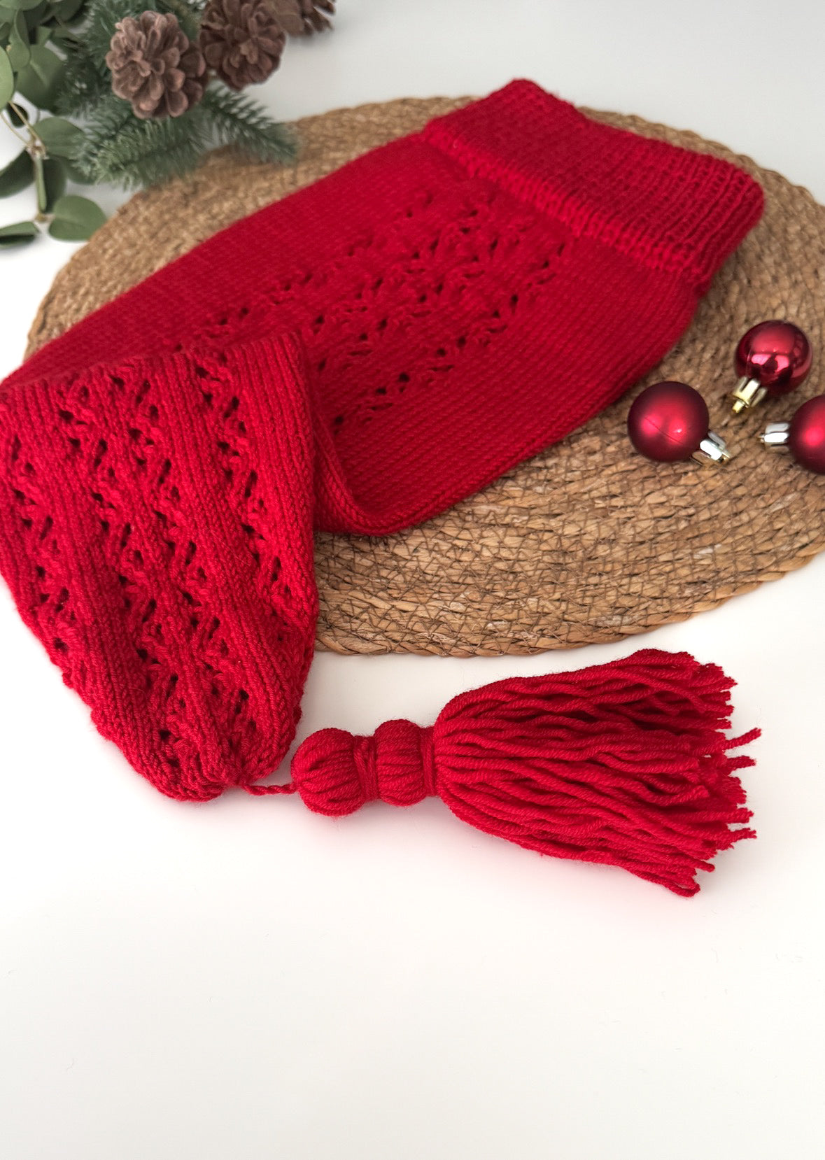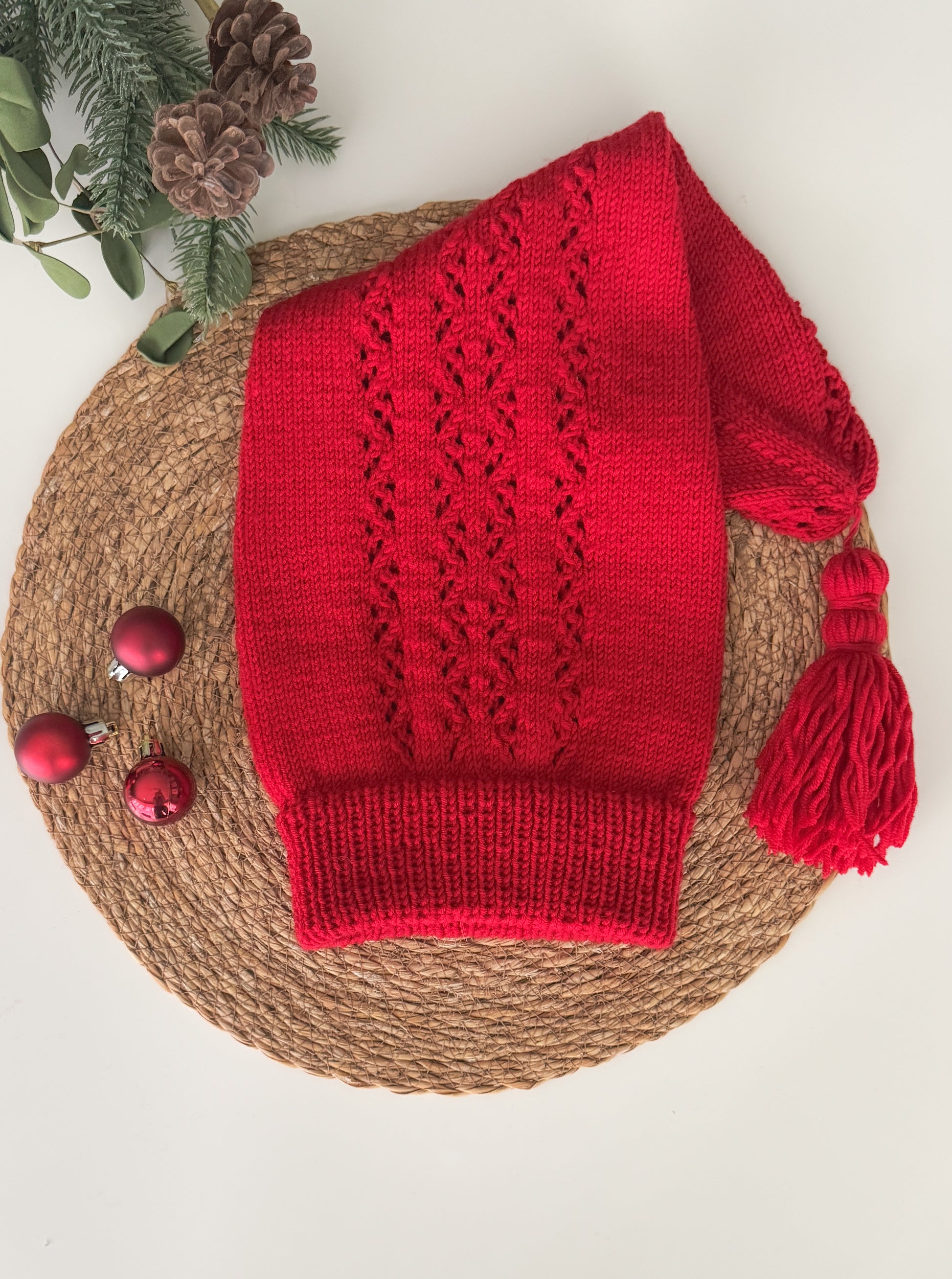 Du starter med å strikke vrangborden som brettes dobbelt og strikkes sammen. Videre strikkes nisseluen i glattstrikk med mønster på luens fremside og med enkel felling på baksiden. Avsluttes med dusk på toppen.